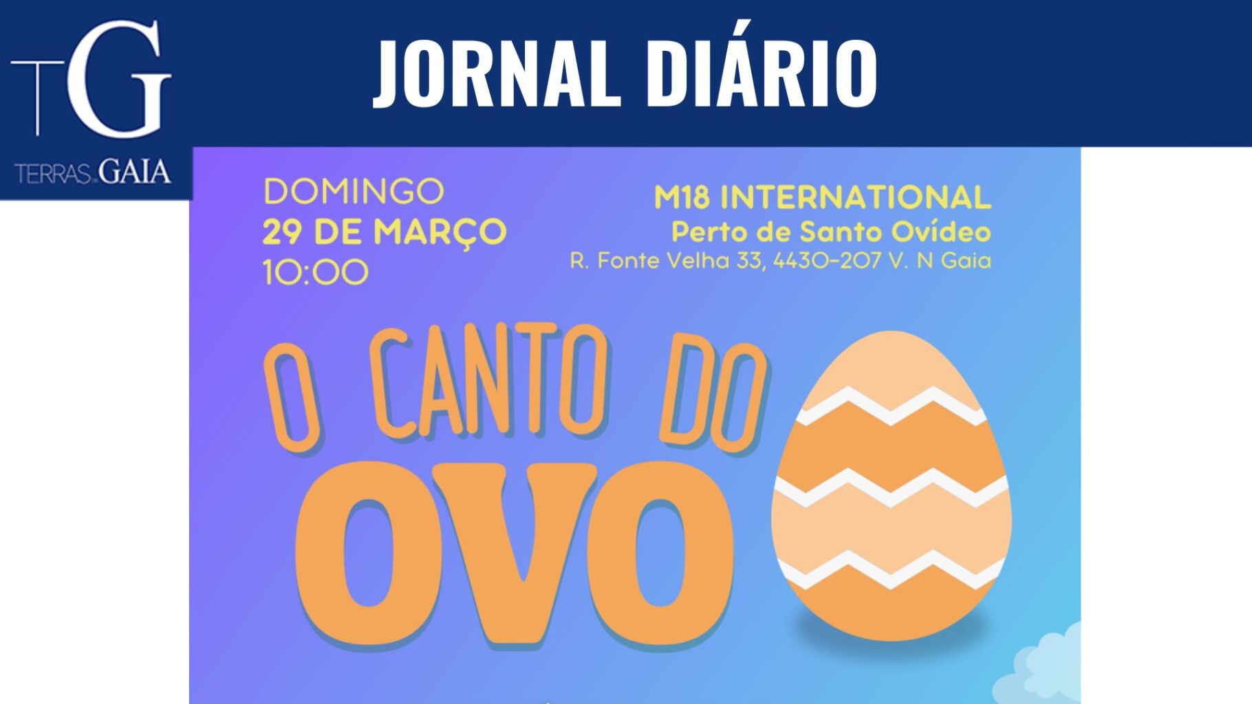 No próximo dia 29 de março, às 10h00, o espaço M18 International – Perto de Santo Ovídio, em Vila Nova de Gaia, recebe o espetáculo “O Canto do Ovo”, uma proposta de teatro sensorial especialmente criada para bebés e crianças. A iniciativa é organizada pela companhia des.ATO – Teatro, que tem vindo a desenvolver projetos artísticos focados na primeira infância.